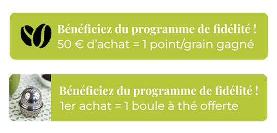 Terra-Kahwa souhaite récompenser votre fidélité à nos cafés et nos thés naturels et sauvages. 1 point gagné pour 50 € d’achat, 1 boule à thé offerte pour votre 1er achat. Une liste de cadeaux est disponibles : cumulez vos GRAINS.