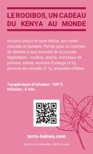 Ce Rooibos du Kenya Terra-Kahwa est cultivé sur les hauts plateaux du Kenya. Notre Rooibos est une infusion douce ayant la particularité d’être dépourvue de théine. Cette tisane de la famille des thés rouges, est réputée pour ses qualités anti-inflammatoires et anti-oxydantes. Elle vous permettra, grâce à ses propriétés apaisantes, de vous offrir un instant de détente à tout moment de la journée.